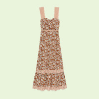 A long flowy cotton dress featuring a whimsical floral print. The feeling of escapism experienced in the latest House's collection finds its peak through Gucci Love Parade. Garments inspired by long picnics on blooming fields appear in the collection through floral dresses enriched with lace details. - Brown cotton with floral print - Lace details - Detachable lining - Lace straps - Back zip closure - Length: 55", based on a size 38 (IT) - Made in Italy - The product in this image is a size 38 (IT)