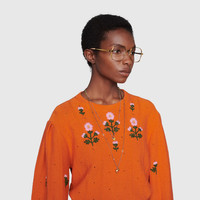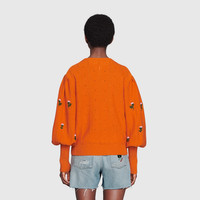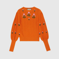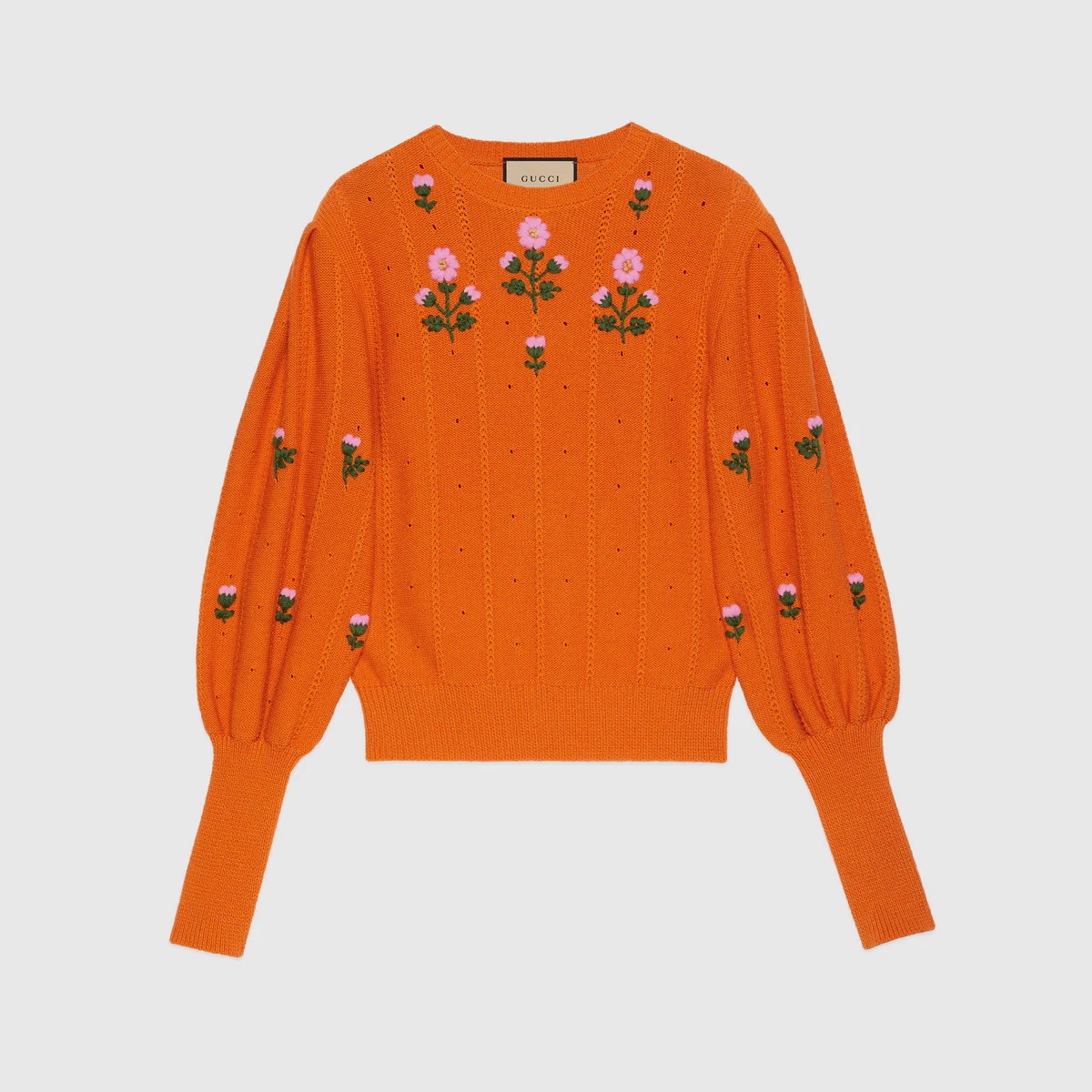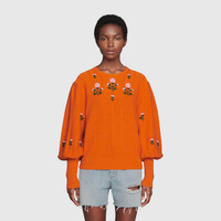 Flowers and embroideries define the knitwear of the Ouverture collection. Presented in a variety of colors, they are reminiscent of handmade pieces from the vintage world. Here, an embroidered floral motif elevates this orange sweater. - Orange wool and cotton knit - Floral embroidery - Crewneck - Ribbed collar, cuffs and bottom - Length: 23.2" based on a size small - Made in Italy - The model is 5'7" tall. The product shown in this image is a size small