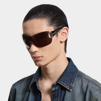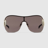 Introducing Spring Summer 2026. Distinctive eyewear shapes are enriched with emblematic signatures that create a fil rouge in the collection. This style is featured in the "Figo" look of La Famiglia. Crafted with black injection temples and a half Horsebit detail, these frameless mask sunglasses are completed with a grey frameless lens. - Frameless mask structure with silver-toned metal - Black injection temples with gold-toned metal cut-out half Horsebit detail - Grey frameless lens - 100% UVA/UVB protection - GG2174S - Temple length: 4.3"; Lens height: 2.2"; Nose bridge length: 0.4" - Frame height: 2.2"; Frame width: 5.6"; Hinge to hinge: 5.4" - Made in Japan - The eyewear case in black is complete with a magnetic closure and GG motif interior.