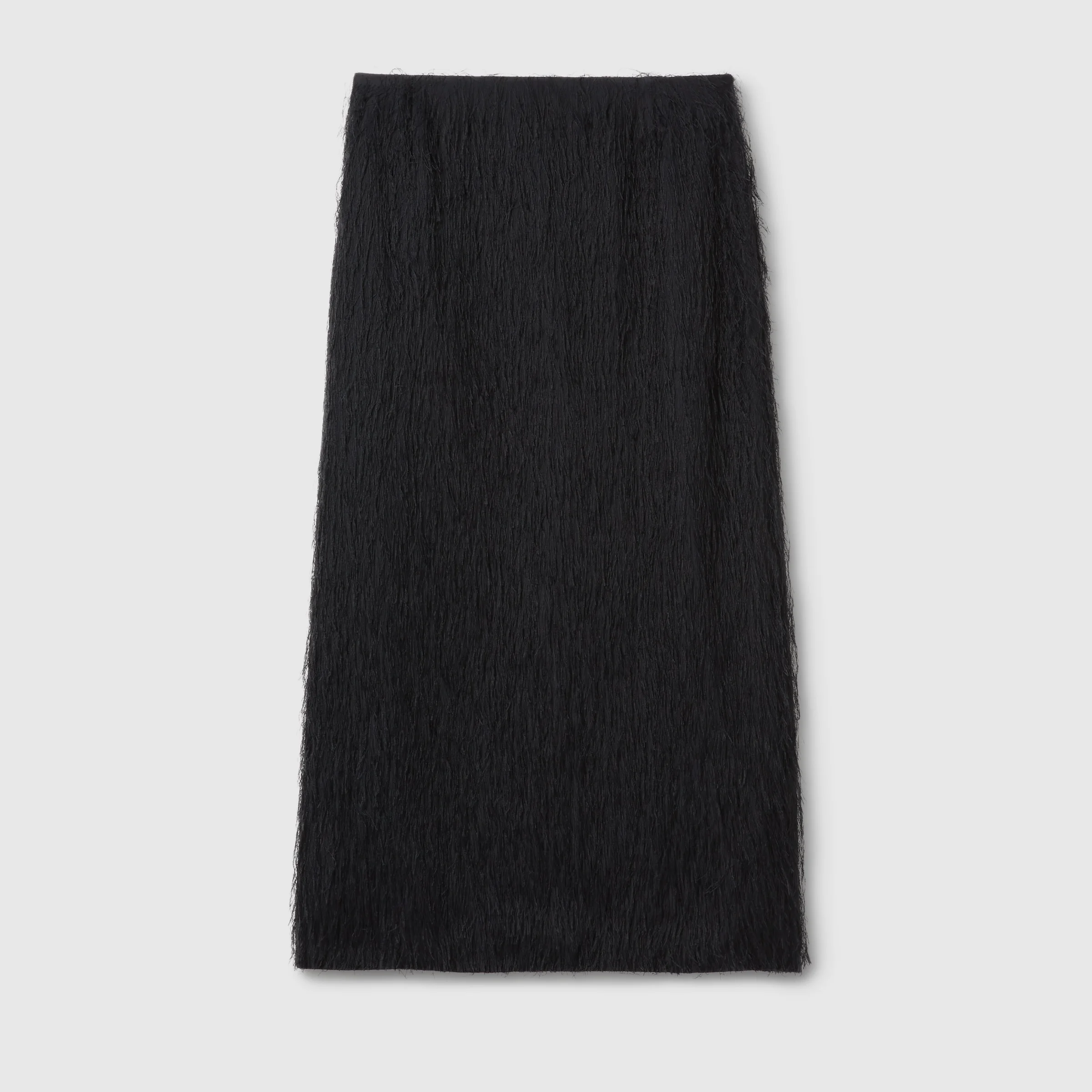 The Cruise 2026 women's ready-to-wear collection highlights sumptuous materials on essential silhouettes to usher in the festive season. This skirt is crafted from black fringed fil coupe fabric. - Black fringed fil coupe fabric - Lined - Hidden zip closure - Length: 31.5"