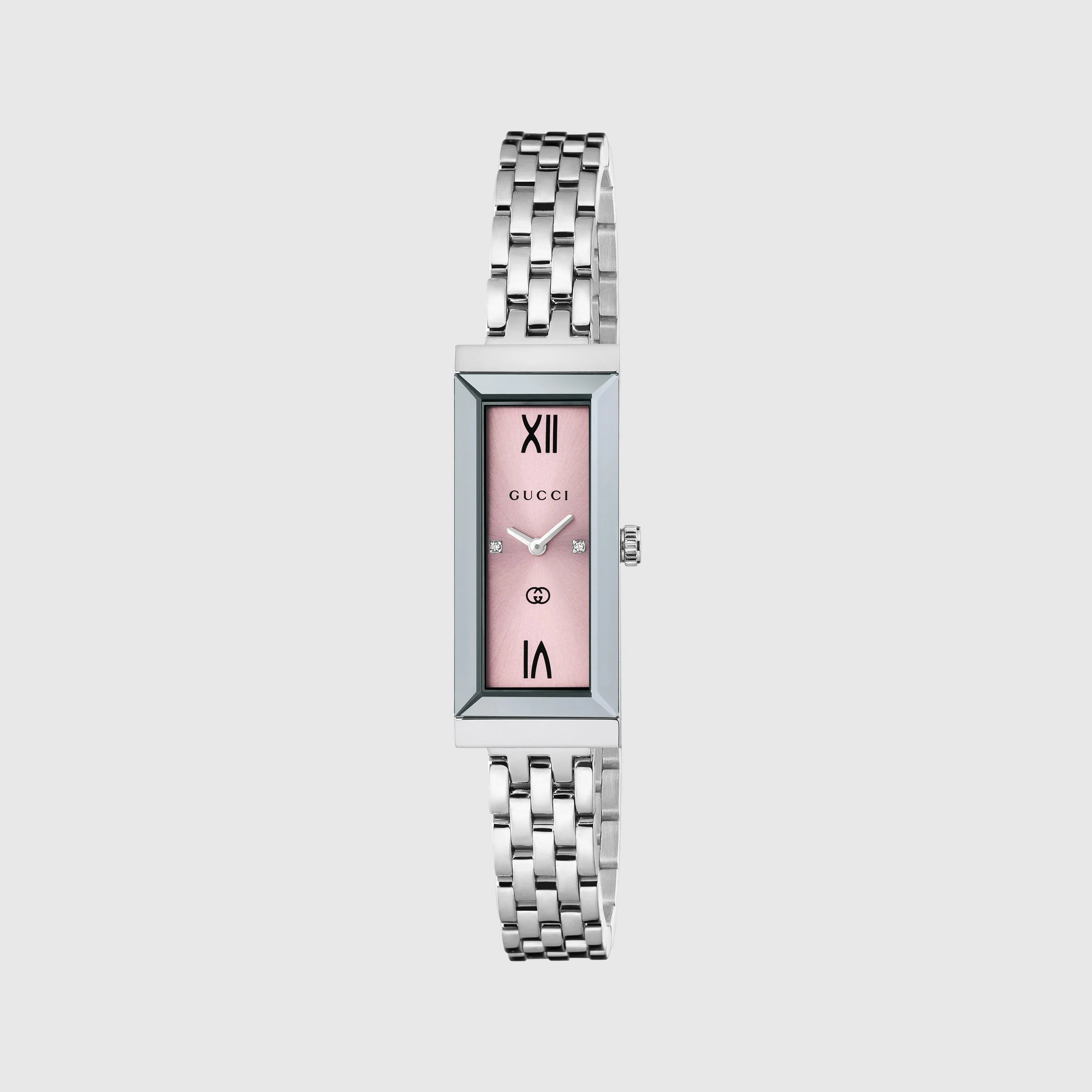 Defined by an elegant rectangular-shaped case, the G-Frame collection blends heritage details with a contemporary aesthetic. Crafted from a stainless steel case, the accessory is further enriched with a pink dial with diamonds. - 14x34mm stainless steel case - Pink dial with dimonds and Roman indexes - Sapphire glass with antireflective coating - Stainless steel bracelet - The warranty certificates for Gucci watches purchased after March 1st 2022 are exclusively available online. - Download your certificate at - by using the serial number engraved on the back of your watch. - Quartz movement - 3 ATM (98 feet/30 meters) - YA127516 - Wrist size from 5.5" to 6.9" - Swiss Made