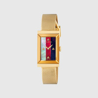 Refined and elegant by definition, this G-Frame watch comes with a mother of pearl dial and interchangeable yellow gold PVD mesh bracelet. The bee, a recurring House code, is present on the Web dial as indexes. - Yellow gold PVD case, Sylvie web mother of pearl dial with bees indexes, interchangeable yellow gold PVD mesh bracelet - The warranty certificates for Gucci watches purchased after March 1st 2022 are exclusively available online. - Download your certificate at - by using the serial number engraved on the back of your watch. - Quartz movement - Water resistance: 3 ATM (100 feet/30 meters) - Wrist size adjustable from 197mm to 251mm - YA147410 - Swiss Made