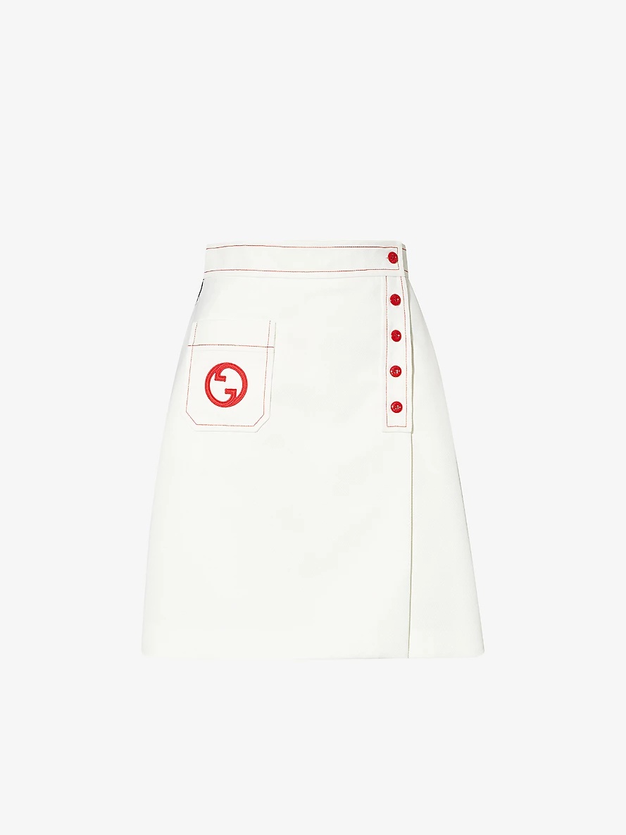 PRODUCT DETAILS - Gucci woven midi skirt - 100% polyester; lining 75% acetate, 25% silk - Button fastening at front - Regular fit, mid-rise, structured waistband, patch pocket at front, brand appliqué at front, contrast stripe trims at sides, contrast stitching, lined - Dry clean only - Made in Italy - True to size - Size UK 8: length 20.5in / 52cm - Model is 5ft 10in/1.78m and wears a size UK 8 - Lightweight, non-stretch