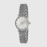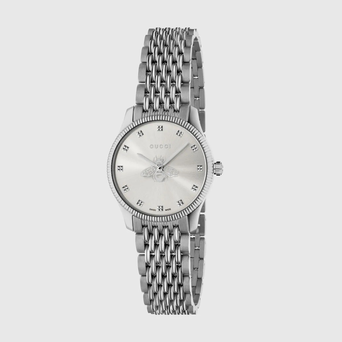 Part of the G-Timeless collection, this classic watch in steel is crafted with a traditional sensibility, juxtaposed with a sunbrushed dial. The bee motif is specially designed to work as the seconds hand. - Steel case, silver sunbrushed dial with bee as seconds hand, 9 links steel bracelet - The warranty certificates for Gucci watches purchased after March 1st 2022 are exclusively available online. - Download your certificate at - by using the serial number engraved on the back of your watch. - Quartz movement - Water resistance: 5 ATM (164 feet/50 meters) - Wrist size adjustable from 120mm to 195mm - YA1265019 - Swiss Made