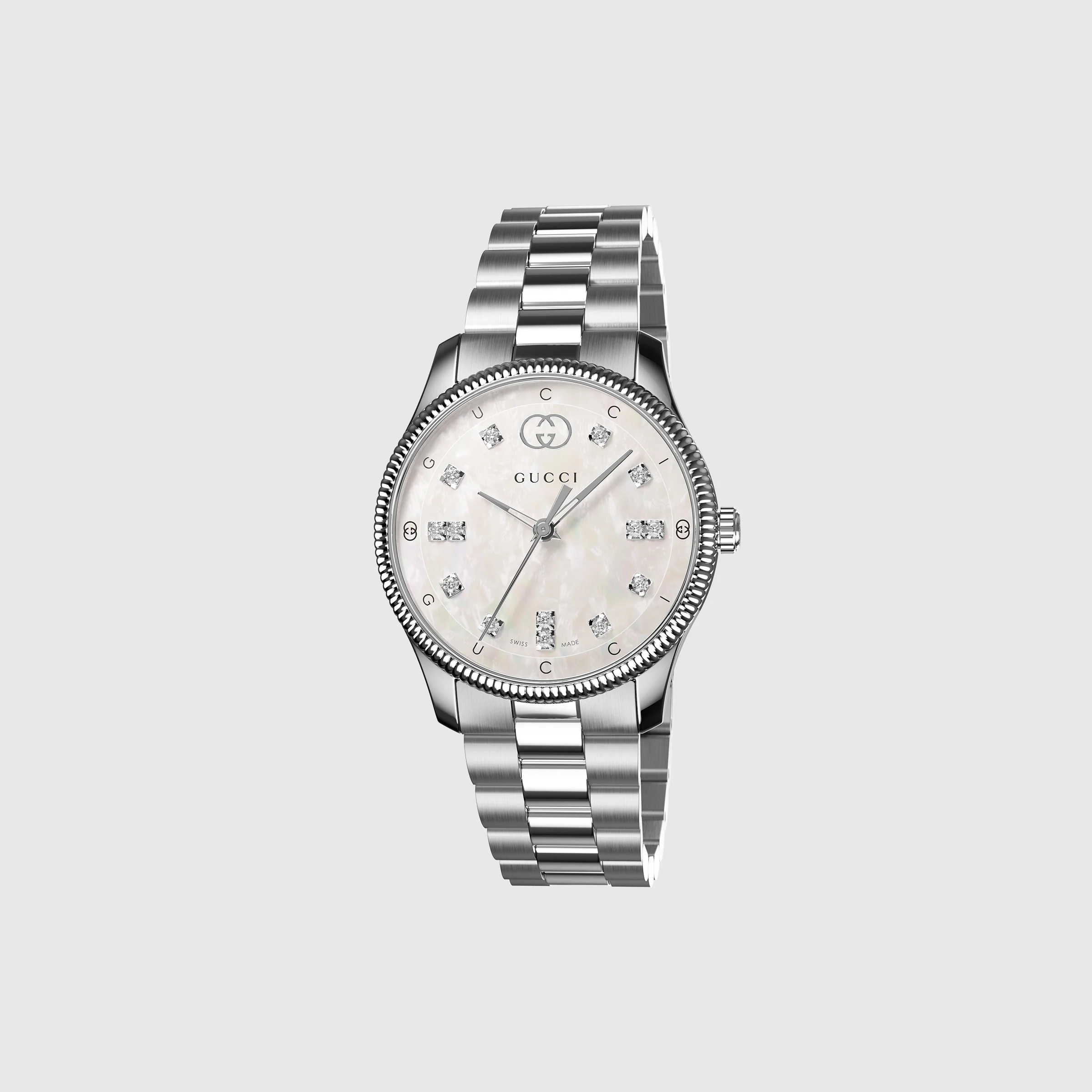 The season's polished look extends to watches and jewelry, including the G-Timeless collection. The round watch spotlights a sleek dial finish with subtle expressions of the Interlocking G, Gucci lettering and signature motifs. Designed with a white mother of pearl dial, the accessory is further enriched with diamond indexes. - 29 mm stainless steel case, white mother of pearl dial with Interlocking G and Gucci lettering, diamond indexes, stainless steel bracelet - Sapphire glass with anti-reflecting coating - The warranty certificates for Gucci watches purchased after March 1st 2022 are exclusively available online. - Download your certificate at - by using the serial number engraved on the back of your watch. - 5 ATM (50 meters/164 feet) - Quartz movement - Wrist size from 4.7" to 7.7" - YA1265064 - Swiss Made - This item is available for pre-launch until March 1.
