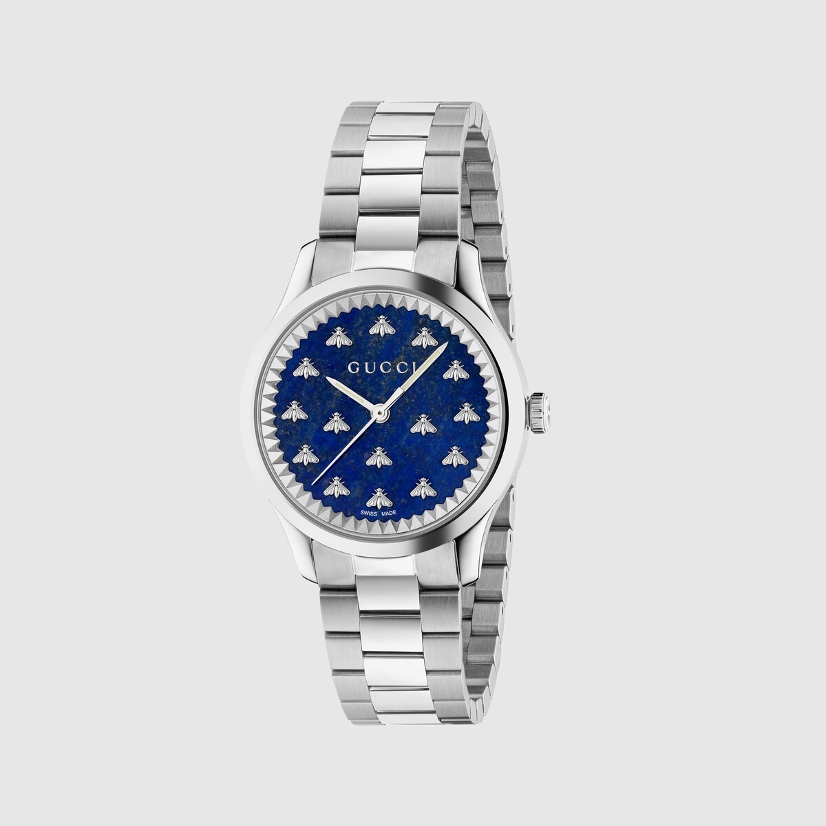The Gucci bee, a historical symbol from the '70s archives, is combined with a dark blue lapiz stone dial and a steel bracelet. The G-Timeless collection combines classic design details with a contemporary aesthetic to create elevated watches with a timeless feel. - 32mm steel case, dark blue lapiz stone dial with bees, steel bracelet - Sapphire glass with antireflective coating - The warranty certificates for Gucci watches purchased after March 1st 2022 are exclusively available online. - Download your certificate at - by using the serial number engraved on the back of your watch. - 5 ATM (164 feet/50 meters) - Quartz movement - Wrist size from 5.1" to 6.9" - YA1265043 - Swiss Made