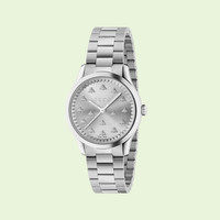 The Gucci bee, a historical symbol from the '70s archives, is combined with a sun brushed dial and steel bracelet. The G-Timeless collection combines classic design details with a contemporary aesthetic to create elevated watches with a timeless feel. - 32mm steel case, silver sunbrushed dial with bees, steel bracelet - Sapphire glass with antireflective coating - The warranty certificates for Gucci watches purchased after March 1st 2022 are exclusively available online. - Download your certificate at - by using the serial number engraved on the back of your watch. - 5 ATM (160 feet/50 meters) - Quartz movement - Wrist size from 5.2" to 7.7" - YA1265031 - Swiss Made