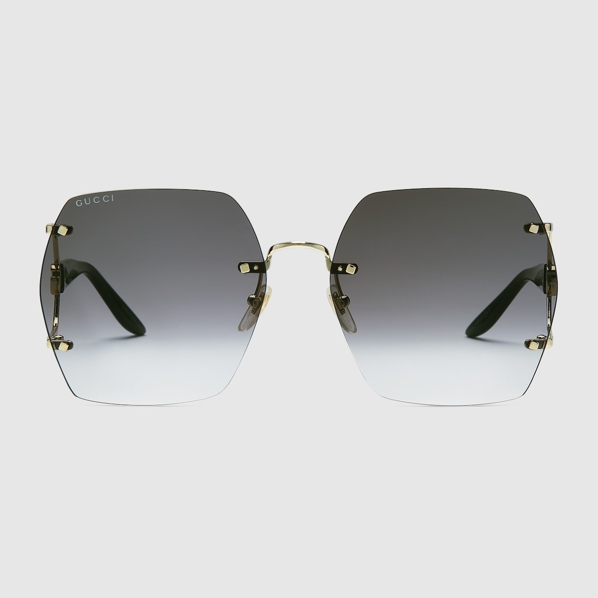 Defined by a frameless construction, these rectangular optical frames recall the lightweight, alternative styles of the 1990s and early 2000s. The shiny yellow gold-toned metal temples spotlights cut-out Double G and shiny black acetate tips. - Geometric frameless structure with shiny yellow gold metal - Shiny yellow gold-toned metal temples with cut-out Double G and shiny black acetate tips - Gradient grey lens - Rubber nose pads - 100% UVA/UVB protection - Frame height: 2.2"; Frame Width: 5.5" - GG1562S - Temple length: 5.5"; Lens height: 2.4", Nose bridge length: 0.7" - Made in Japan - The glasses will arrive in a velvet case, available in a range of six jewel-toned colors, and paired with a coordinating satin lining. The case color will be individually selected for each pair of glasses, and comes with a matching satin flannel pouch and ivory microfiber cloth.