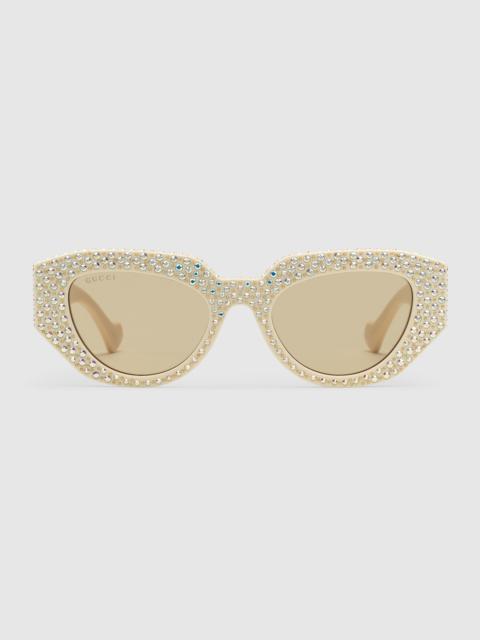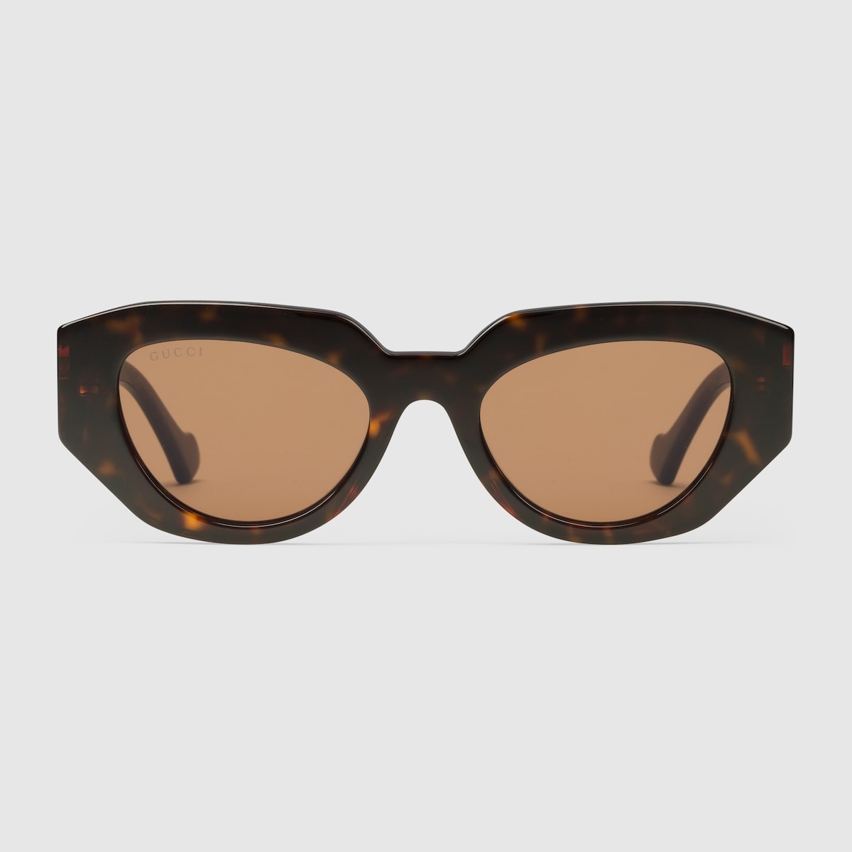 Frames with unique silhouettes and logo details accompanied key looks during the latest collections. This geometric frame is crafted from tortoiseshell acetate with a gold-toned Double G detail along the temples. - Shiny tortoiseshell acetate frame - Shiny tortoiseshell acetate temples with Double G - Solid brown lens - 100% UVA/UVB protection - Frame height: 1.9"; Frame width: 5.7" - GG1421S - Temple length: 5.7"; Lens height: 2.2", Nose bridge length: .8" - The glasses will arrive in a velvet case, available in a range of six jewel-toned colors and paired with a coordinating satin lining. The case color will be individually selected for each pair of glasses and comes with a matching satin flannel pouch and ivory microfiber cloth.
