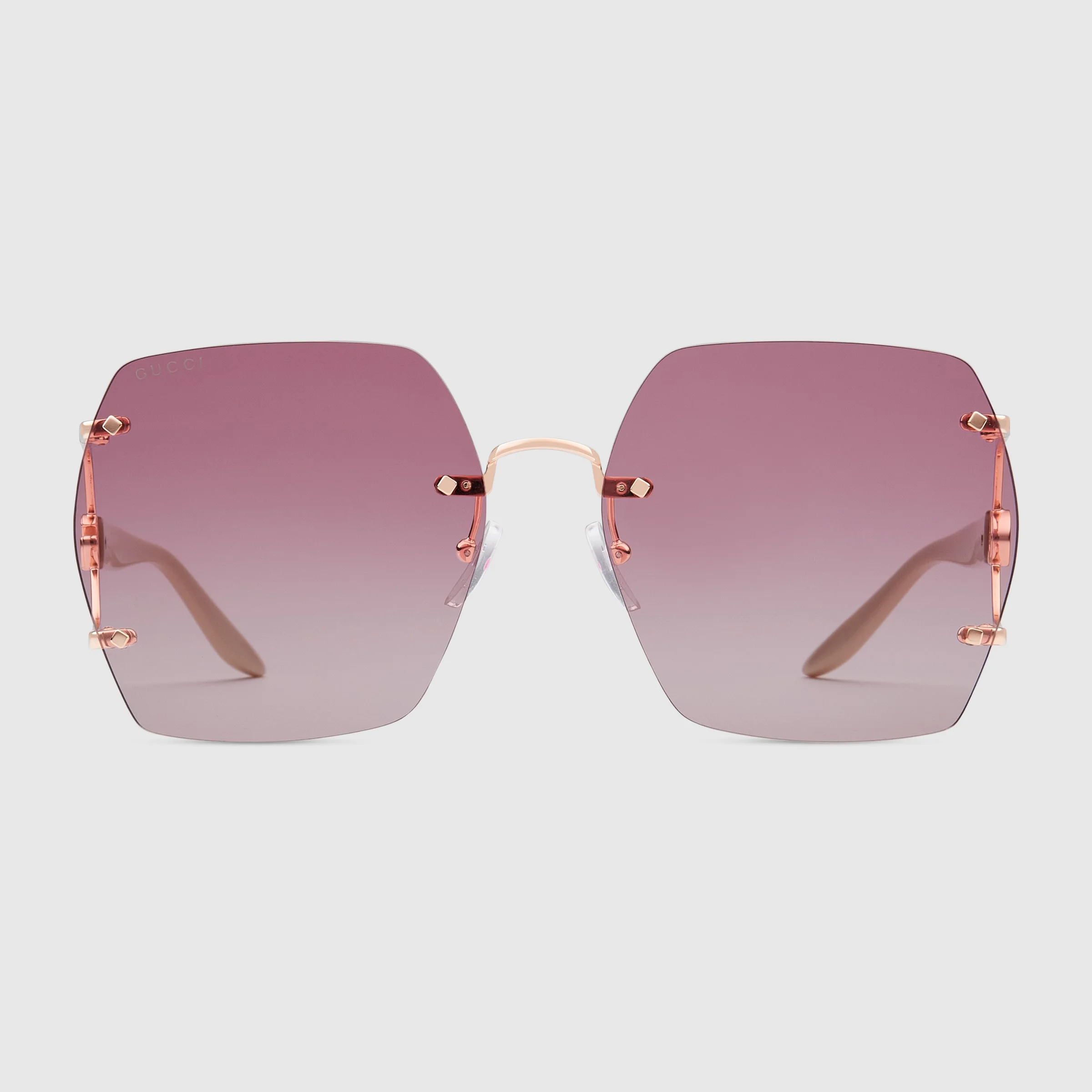 Defined by a frameless construction, these rectangular optical frames recall the lightweight, alternative styles of the 1990s and early 2000s. The shiny rose gold-toned metal temples spotlights cut-out Double G and shiny solid ivory acetate tips. - Geometric frameless structure with shiny rose gold metal - Shiny rose gold-toned metal temples with cut-out Double G and shiny solid ivory acetate tips - Gradient magenta lens - Rubber nose pads - 100% UVA/UVB protection - Frame height: 2.2"; Frame Width: 5.5" - GG1562S - Temple length: 5.5"; Lens height: 2.4", Nose bridge length: 0.7" - Made in Japan - The glasses will arrive in a velvet case, available in a range of six jewel-toned colors, and paired with a coordinating satin lining. The case color will be individually selected for each pair of glasses, and comes with a matching satin flannel pouch and ivory microfiber cloth.