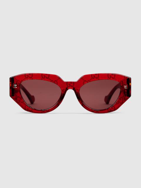 Frames with unique silhouettes and logo details accompanied key looks during the latest collections. This geometric frame is crafted from pink acetate with a gold-toned Double G detail along the temples. - Shiny pink acetate frame - Shiny pink acetate temples with Double G - Solid pink lens - 100% UVA/UVB protection - Frame height: 1.9"; Frame width: 5.7" - GG1421S - Temple length: 5.7"; Lens height: 2.2", Nose bridge length: .8" - The glasses will arrive in a velvet case, available in a range of six jewel-toned colors and paired with a coordinating satin lining. The case color will be individually selected for each pair of glasses and comes with a matching satin flannel pouch and ivory microfiber cloth.