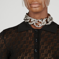 Taking inspiration from the archives, this classic polo shirt is enriched with the House's monogram. Representative of founder Guccio Gucci's initials, here the emblem cascades across a cotton and silk fabric base, creating a tonal contrast against a black ribbed trim. - Black geometric G cotton and silk blend fabric - Rib knit trim - Point neck - Short sleeves - Button closure - Length: 23.2", based on a size small - The product shown in this image is a size small