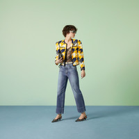 Gucci rewrites the rulebook for traditional suiting in womenswear. This fitted viscose jacket reveals an eye-catching geometric houndstooth print in yellow and blue, while the contrasting grosgrain trim adds an unexpected twist. - Geometric houndstooth print yellow and blue viscose - Contrasting grosgrain trim - Lined - Crewneck - Padded shoulders - Two front patch pockets - Fitted waist - Button closure - Length: 18.8", based on a size 38 (IT) - Made in Italy - The product shown in this image is a size 38 (IT)