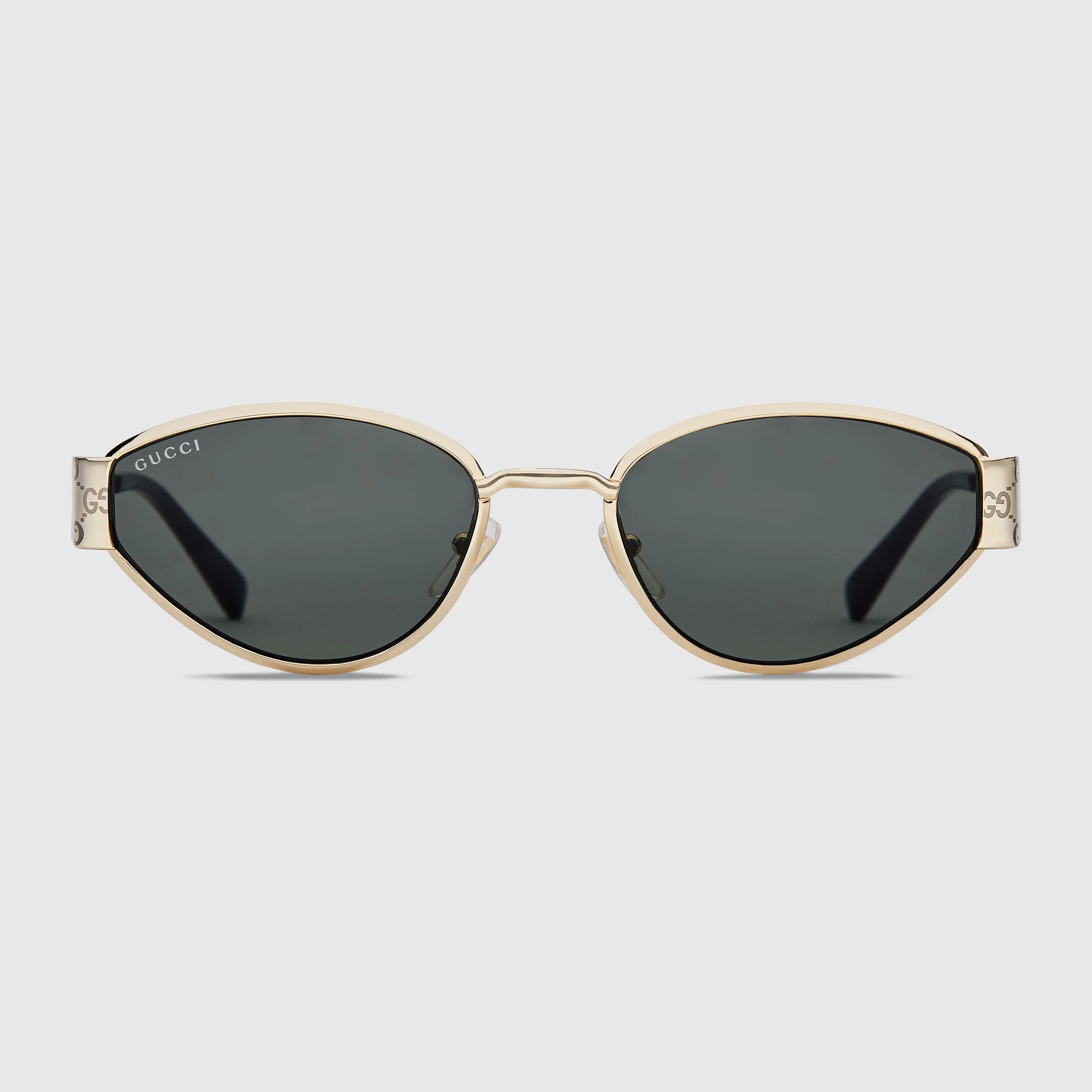 The Cruise 2025 eyewear collection blends an essential silhouette with signature elements. These geometrical sunglasses are accentuated by an allover GG motif on the temples. - Shiny light gold-toned metal frame - Shiny light gold-toned metal temples with allover lasered GG motif and black endtips - Solid grey lens - 100% UVA/UVB protection - GG1853S - Temple length: 5.7"; Lens height: 1.5"; Nose bridge length: 0.7" - Frame height 1.6"; Frame width 5.6"; Hinge to hinge 5.3" - Made in Japan - The eyewear case in the House’s signature Rosso Ancora red hue is complete with a magnetic closure and white interior.