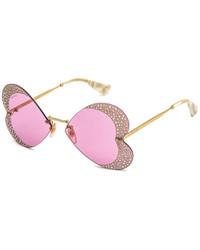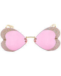 These gold metal sunglasses are imbued with a pop inspired feel with a heart-shaped frame and embellished with allover crystals. Pink lenses complete the look. - Gold metal frame with Mother of pearl effect - Gold metal temples with Gucci script - Pink lens with pavé crystals - 100% UVA/UVB protection - Temple length: 5.5", lens height: 2.5", nose bridge length: .6" - Frame height: 2.5", frame width: 5.2" - Made in Italy