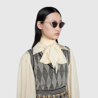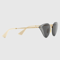 A whimsical evolution of the classic cat-eye–a silhouette that started to take shape in the late ‘50s. Reimagined in a more geometric shape, encrusted crystals play into the geometric frame with references to optical art. - Gold metal frame with Mother of pearl effect - Gold metal temples with Gucci script - Grey lens - Crystal encrusted front - 100% UVA/UVB protection - Temple length: 5.5", lens height: 1.8", nose bridge length: .7" - Frame height: 1.2", frame width: 5.6" - Made in Italy