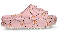 The artwork by America-based illustrator and designer, Angela Nguyen, also known as 'Pikarar', adds a playful touch to ready-to-wear pieces and accessories with vibrant prints or embroideries inspired by pop culture, anime, and animals. Here this rubber slide is defined by a GG animal print. - GG animal print light pink rubber - Women's - Artwork by Angela Nguyen 'Pikarar' - Embossed Interlocking G - Rubber sole - Low heel - Made in Italy