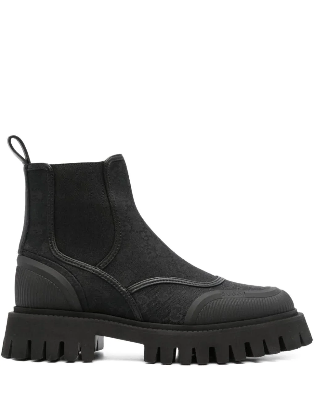 GG canvas Chelsea boots Gucci references the brand's heritage in a contemporary way in this pair of ankle boots. Featuring a panelled design, it boats the brand's classic GG canvas surrounded by leather trims, tying in with current branding trends in a sophisticated way. Highlights - Black - Classic gg canvas - Leather trim - Panelled design - Elasticated side panels - Round toe - Ankle-length - Rubber toecap - Pull-tab at the heel - Chunky rubber sole - Slip-on style Made in Italy Composition Outer: Canvas 100%, Calf Leather 100% Sole: Rubber 100% Lining: Calf Leather 100% SIZE & FIT Measurement CIRCUMFERENCE 7.48 in(19 cm) HEEL 2.36 in(6 cm) HEIGHT 4.72 in(12 cm) Sole height 1.37 in(3.5 cm)