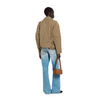 The Cruise 2026 women's ready-to-wear collection celebrates the Gucci wardrobe, blending archival influence with the history of Florence in a playful melange, ranging from the minimal to the maximal. Crafted from GG canvas, this bomber jacket is elevated with a contrast leather collar. - Camel and dark brown GG canvas - Lined - Leather point collar - Front pockets - Adjustable side buckles - Long sleeves - Front zip closure and covered buttons - Length: 23.6" - Details: Cow leather - Fabric: 70% Cotton, 30% Polyester - Lining: 100% Viscose