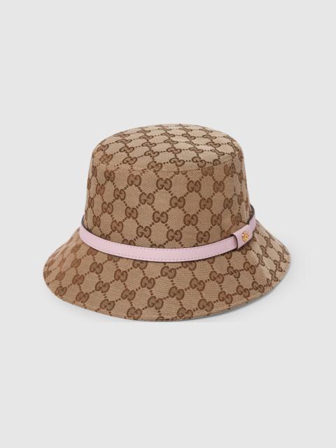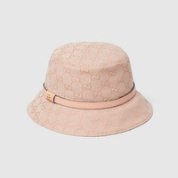 The House's silk accessories collection continues to reinterpret emblematic motifs, from the GG, Web, Flora, bamboo, Horsebit and equestrian inspirations, in sumptuous materials, intricate craftsmanship, and fresh hues. Stated in GG canvas, this bucket hat is enriched with a tonal leather trim and a Double G detail. - Pink GG canvas - Pink leather trim - Cotton lining - Double G - Made in Italy - Main fabric: cotton 70%, polyester 30%; lining: cotton 100%; detail: lambskin; inner detail: cotton 55%, viscose 45%