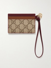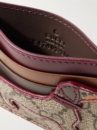 Gucci's cardholder is appliqued with a playful puppy at the front. It's been made in Italy from panels of printed coated-canvas and leather and is fitted with four card slots plus a center one for bills or receipts. Use the wristlet strap for easy carrying.