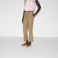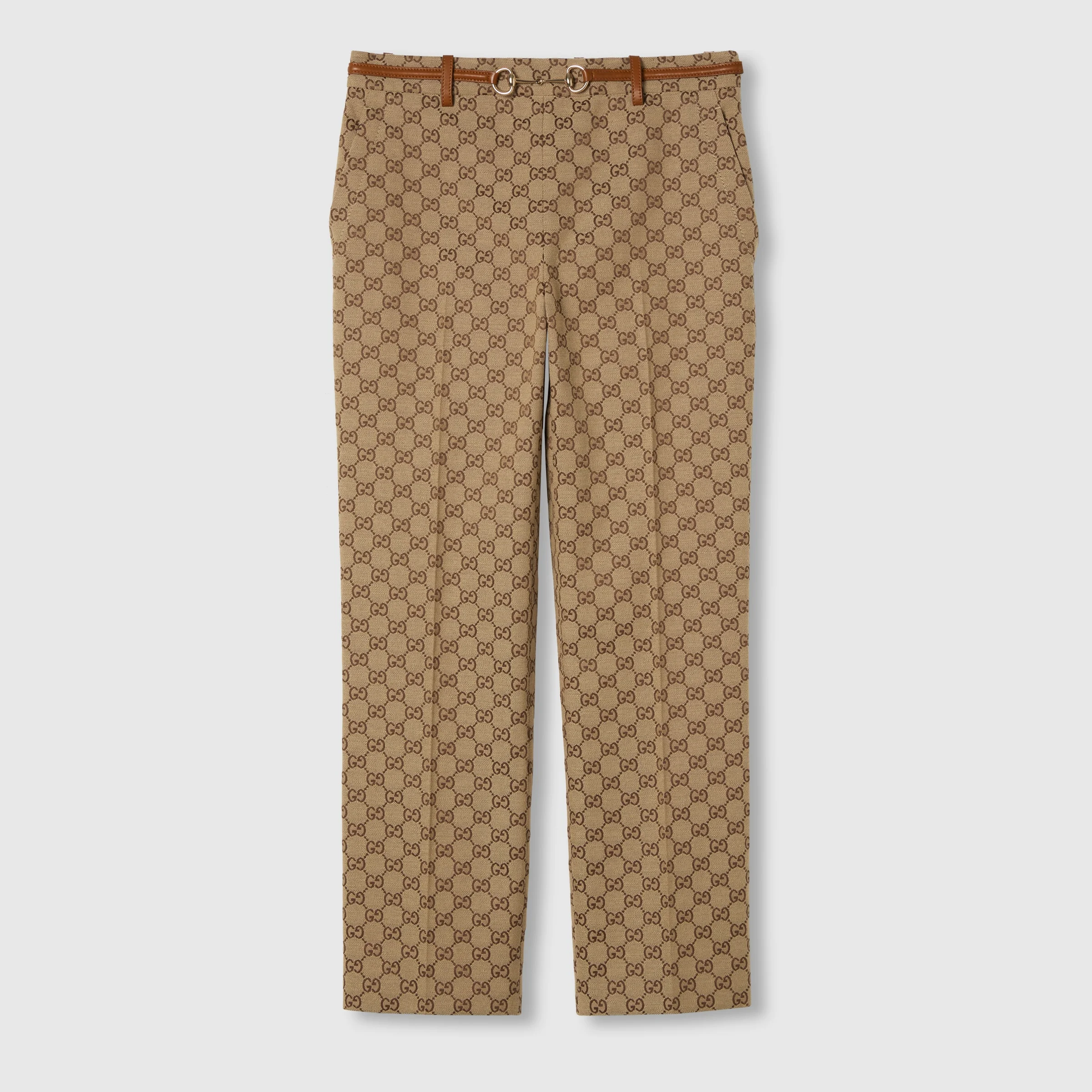 The GG monogram reinterprets the House’s history of elegance and craftsmanship. Crafted from a GG canvas, these pants are defined by a leather belt with Horsebit buckle. - Camel and dark brown GG canvas - Brown leather trim - Lined - Belt loops - Leather belt with Horsebit buckle - Two side pockets - Two back pockets - Pleated - Hidden side zip closure - Total length: 36.4"; Total waist: 29.9"; Total hips: 37.4"; Total hem width: 16.3"; based on a size 38 IT - Made in Italy - The product shown in this image is a size 40 (IT)