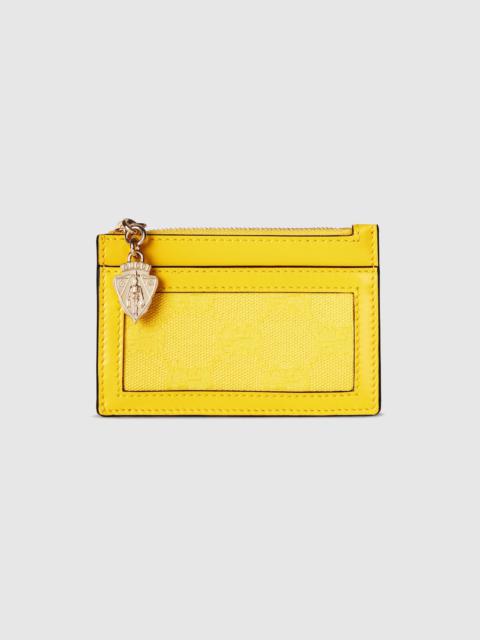 The new GG canvas lends itself to this streamlined card case wallet. The black motif is accentuated by a tonal leather trim and light gold-toned Gucci Crest zip puller. - Black GG canvas - Black leather trim - Light gold-toned metal hardware - Moiré lining - Gucci Crest zip puller - Outside: Three card slots - Zip closure - Closed: 4.5"W x 2.9"H x 0.5"D - Made in Italy - Weight: .11lbs, approximately