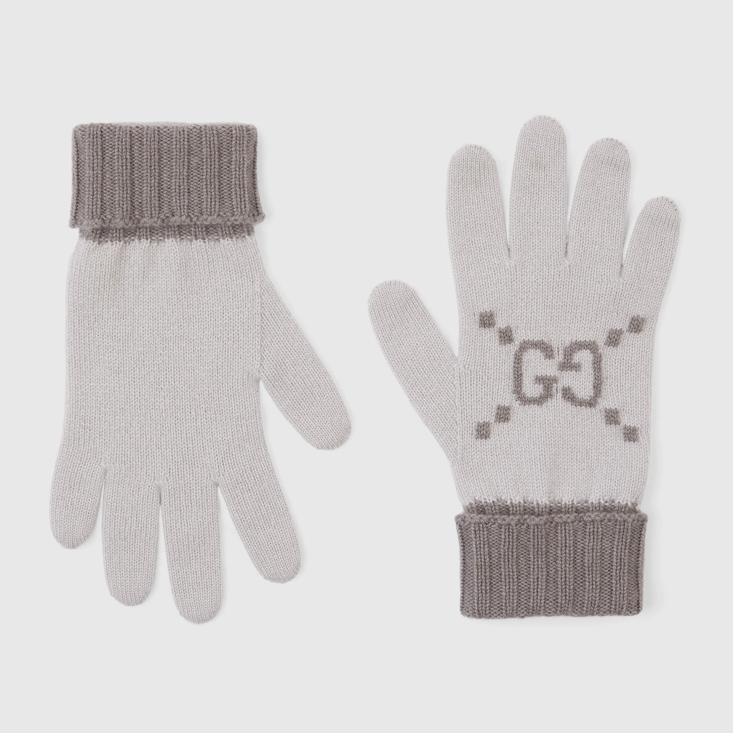 The initials of the Founder of the House, Guccio Gucci, alternate across a selection of soft accessories. These gloves are stated in a GG cashmere jacquard and completed with a rib knit trim. - Ivory and light grey GG cashmere jacquard - Rib knit trim - Made in Italy