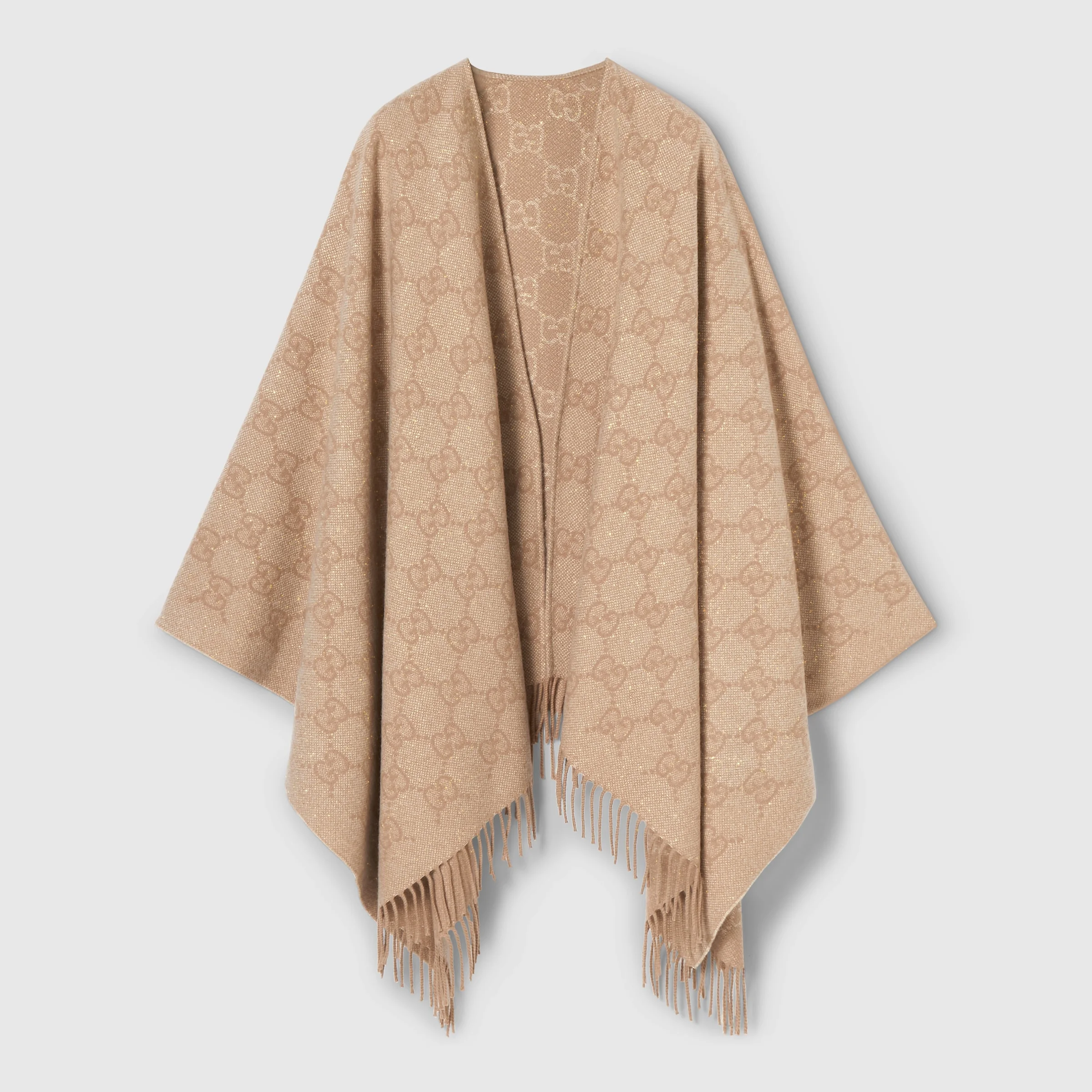 The House's silk accessories collection continues to reinterpret emblematic motifs, from the GG, Web, Flora, bamboo, Horsebit and equestrian inspirations, in sumptuous materials, intricate craftsmanship, and fresh hues. This cape is presented in a GG cashmere lame with a fringe trim. - White and beige GG cashmere lame - Fringe trim - 53.1"W x 53.1"L