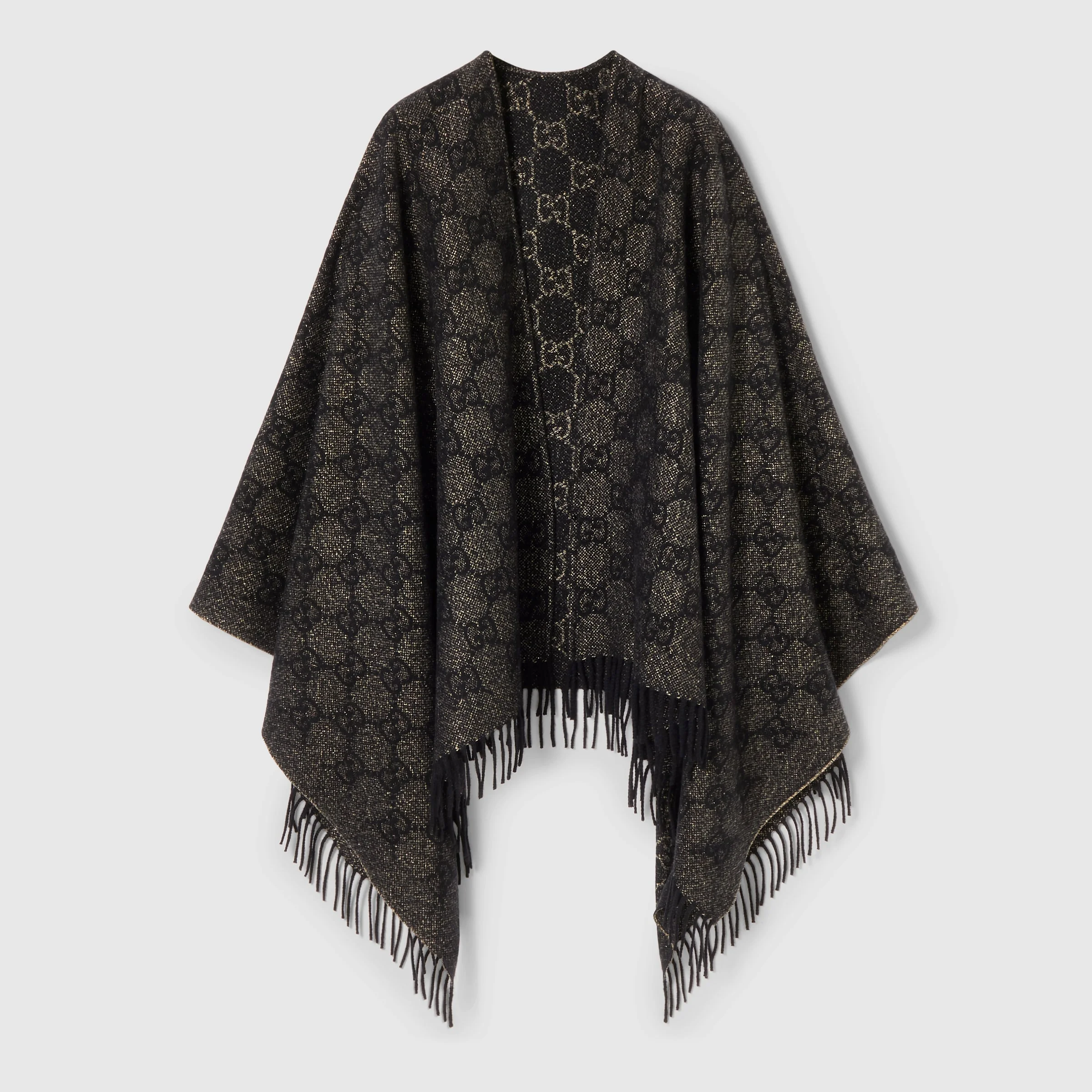 The House's silk accessories collection continues to reinterpret emblematic motifs, from the GG, Web, Flora, bamboo, Horsebit and equestrian inspirations, in sumptuous materials, intricate craftsmanship, and fresh hues. This cape is presented in a GG cashmere lame with a fringe trim. - Black and grey GG cashmere lame - Fringe trim - 53.1"W x 53.1"L