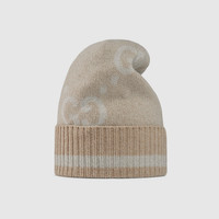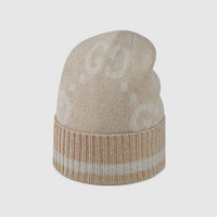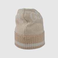 For Cruise 2024, the House's monogram is revisited and reimagined in new variations. Inspired by the Gucci rhombi pattern, the historic motif decorates this camel and white cashmere hat. A striped rib trim completes the accessory. - Camel and white GG cashmere lamé jacquard - Striped rib knit trim - Made in Italy