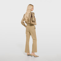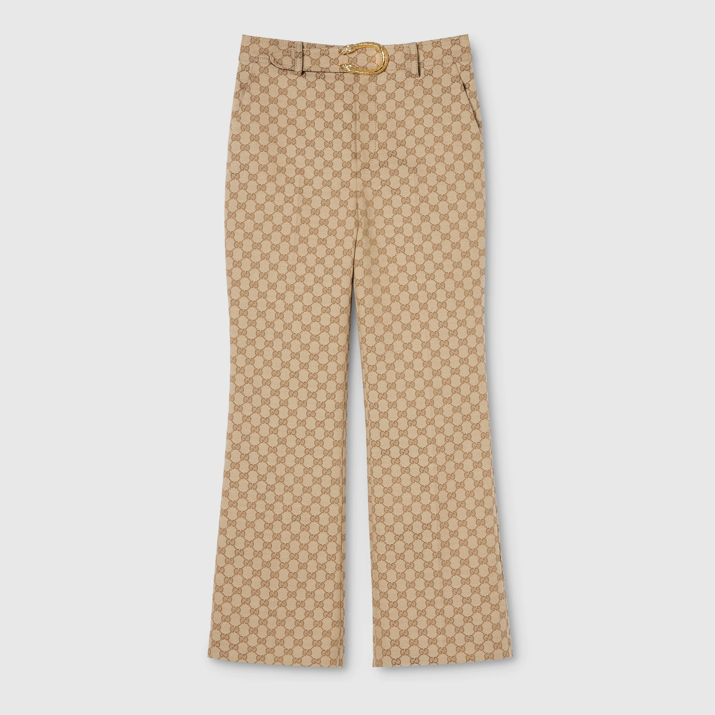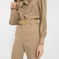 Introducing Spring Summer 2026. This style is inspired by the "La V.I.C." and "La V.I.P." look of La Famiglia. The collection reinterprets the House’s codes through singular personalities and distinctive aesthetic attitudes. This pair of pants is presented in GG cotton canvas jacquard fabric. - Sand GG cotton canvas jacquard fabric - Leather trim - Unlined - Detachable Dionysus buckle belt - Side and back pockets - Length: 38.8", Leg opening: 19.1", based on a size 38(IT) - Made in Italy - Leather lining: Goat leather - Fabric: 52% Polyester, 24% Cotton, 24% Polyamide - Pocket lining: 75% Acetate, 25% Silk