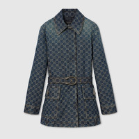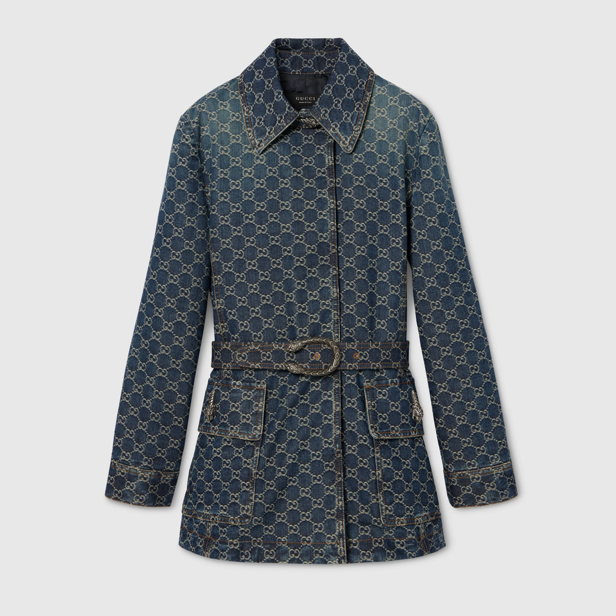 Introducing Spring Summer 2026. This style is part of the La Famiglia collection, which reinterprets the House’s codes through singular personalities and distinctive aesthetic attitudes. Crafted from bleached certified GG cotton denim jacquard, this jacket is enriched with an adjustable Dionysus buckle belt. - Blue washed bleached certified GG cotton denim jacquard - Tiger head detail - Cotton lining - Adjustable Dionysus buckle belt - Point collar - Side pockets - Long sleeves - Length: 27.9", based on a size 40(IT) - Made in Italy - Removable leather belt: Goat leather - Fabric: 100% Cotton - Lining: 100% Viscose - Pocket lining: 65% Polyester, 35% Cotton - Removable belt: 100% Cotton