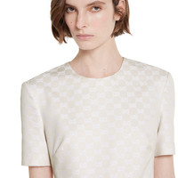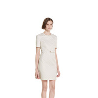 A monochrome palette with subtle details, such as embroideries or logo hardware, transitions the wardrobe from day to night in a selection of pieces from the Pre-Fall 2025 collection. This GG cotton gabardine dress features a detachable Double G leather belt, combining two signature House motifs atop a classic silhouette. - Beige GG cotton gabardine - Unlined - Crewneck - Short sleeves - Detachable Double G leather belt - Zip closure - Made in Italy