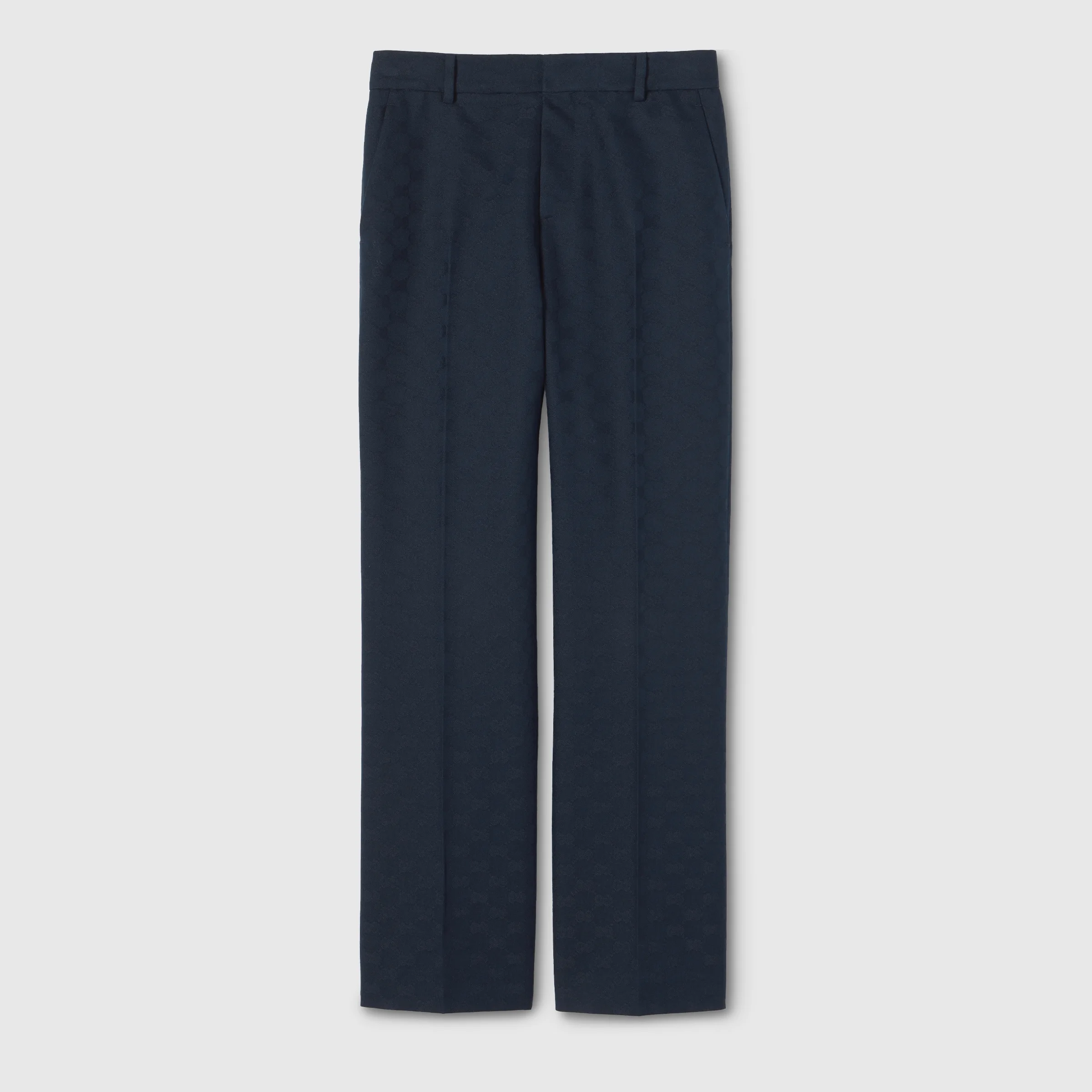 In the Cruise 2026 collection, the heritage-driven narrative is expressed with traditional GG fabrics. These pants are crafted from GG cotton gabardine. - Blue GG cotton gabardine - Unlined - Belt loops - Side and back pockets - Tab and hook closure - Length: 39.3"; Leg opening: 18.8"; based on a size 40(IT) - Made in Italy - Fabric: 55% Polyester, 45% Cotton - Lining: 100% Viscose