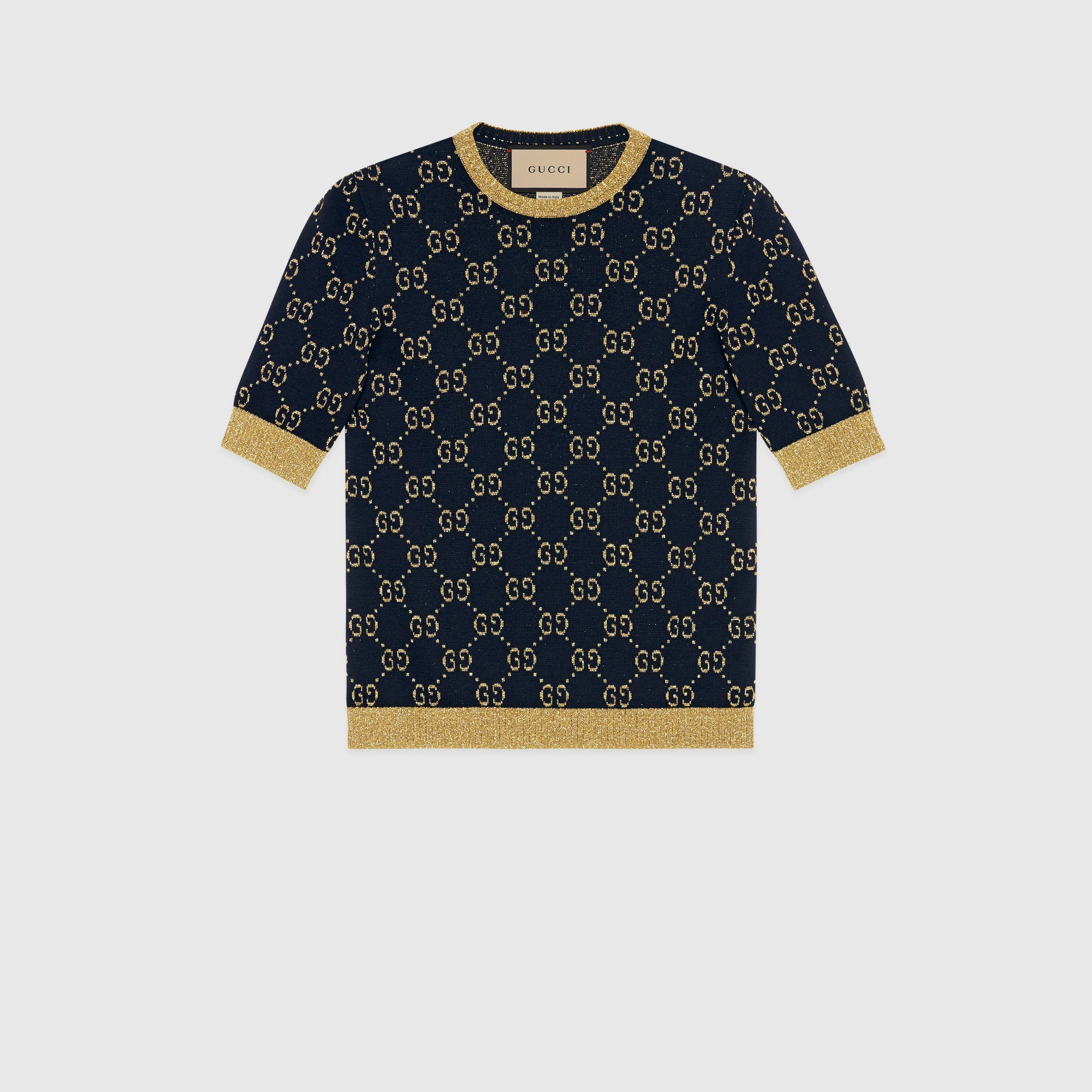 For Cruise 2019 new styles are explored by incorporating original design elements and highlighting the House's defining codes. Introduced in the '70s as an evolution of the historical Gucci rhombi design, the GG pattern has become synonymous with the House and is here presented in gold lamé, contrasting a black wool base. - Black wool with GG pattern in lamé - Gold lamé trim - Short sleeves - Crewneck - 74% Wool, 13% Polyamide, 13% Metallised Fiber - Made in Italy - The model is 5'10" and wearing size small
