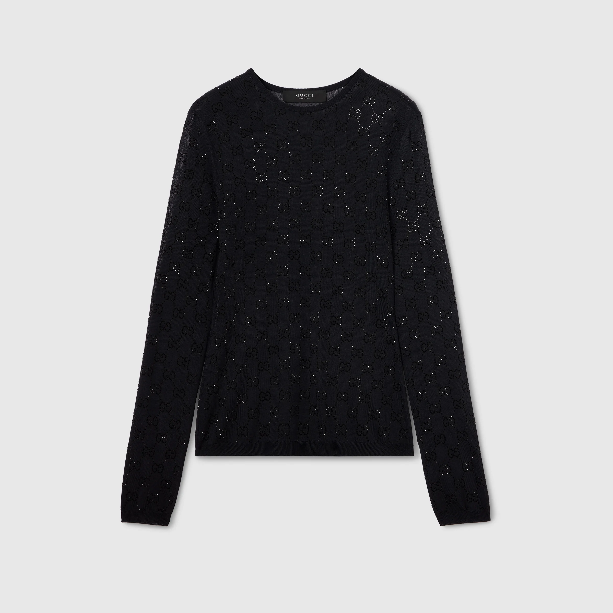 Introducing Spring Summer 2026. This style is inspired by the "La Diva" look of La Famiglia. The collection reinterprets the House’s codes through singular personalities and distinctive aesthetic attitudes. This crewneck top is enriched with an allover heat-applied GG crystal embroidery. - Black fine viscose - Allover heat-applied GG crystal embroidery - Crewneck - Long sleeves - Length: 22.4", based on a size XS - Made in Italy - Fabric: 100% Viscose - Non textile application: 100% Glass