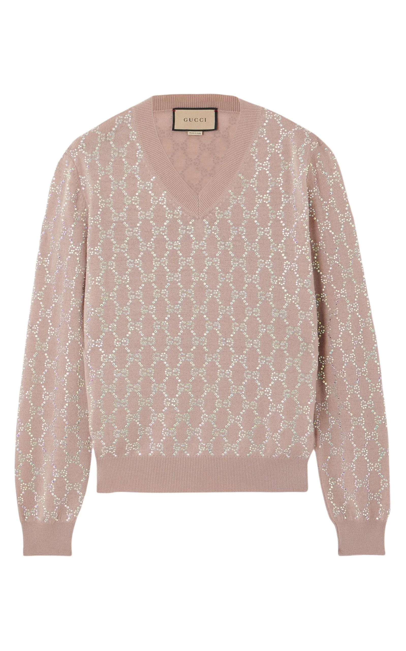 Sprinkle sparkle into your everyday with Gucci Crystal-embellished Wool Sweater. It's knitted from soft wool and decorated with the iconic 'GG' lettering in shining crystals. Blush pink wool Fine knit Signature GG crystal embroidery V-neck Long sleeves Drop shoulder Ribbed cuffs and hem Composition: Wool 96%, Polyamide 3%, Elastane 1%,glass 100% Machine Wash Made in Italy Have Questions about us, read our FAQ