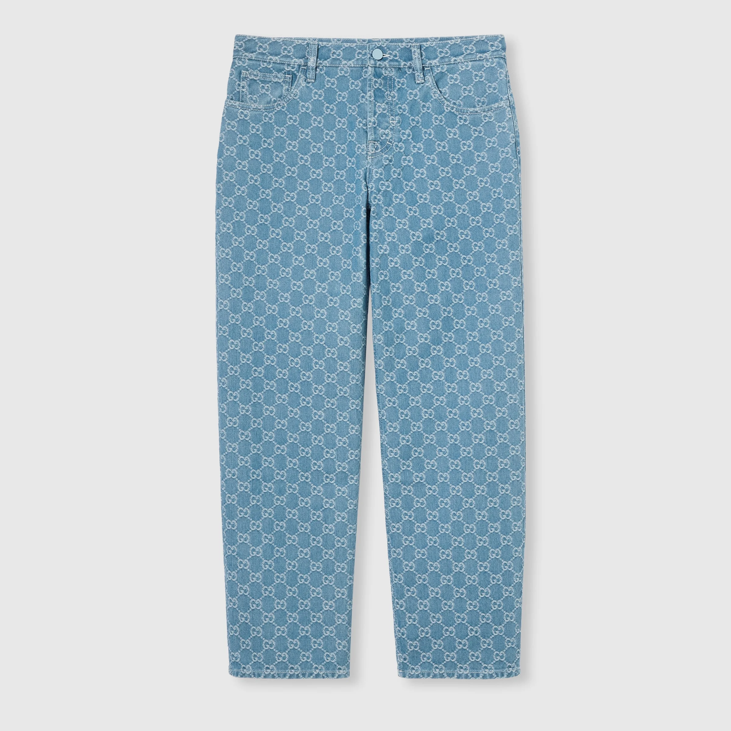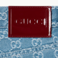 The House's heritage motifs are presented on a backdrop of sophisticated textures, from off-duty denim to lightweight canvas and refined suede, for the Pre-Fall 2025 collection. The GG denim jacquard returns atop a contemporary pair of pants, complete with tonal enamel Gucci button and naplak label. - Blue and ivory washed GG denim jacquard - Blue enamel Gucci button - Gucci Rosso Ancora naplak label - Five-pocket style - Belt loops - Made in Italy