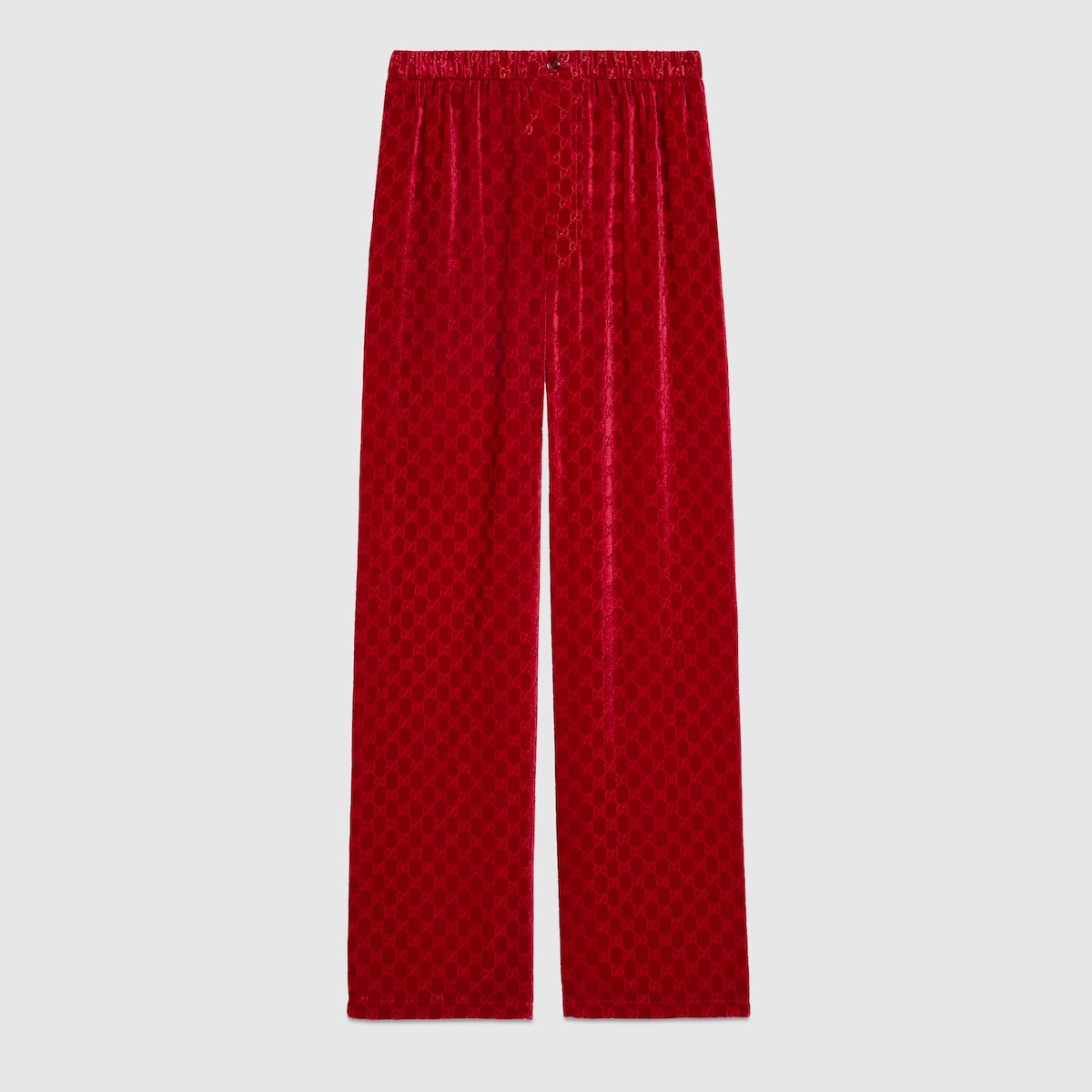 Fiery accents from hot pink to bright red can be found throughout the collection across outwear, daytime skirts, evening dresses, and handbags, adding a spark of warmth to cold weather. This textured pant is presented in red GG devoré velvet and completed with a self-covered button revealing a G detail. - Red GG devoré velvet - Self-covered button with G detail - Elastic waist - Two side pockets - Button closure - Length: 43.3" based on a size 40 (IT) - Leg opening: 19.2", based on a size 40 (IT) - Made in Italy - The product shown in this image is a size 40 (IT)