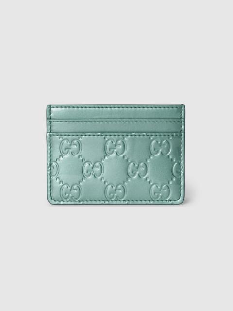 In the Fall Winter 2025 collection, the GG Emblem collection reinterprets the House’s history of elegance and craftsmanship. This card case highlights its functional design with four card slots and one open pocket. - Light blue patent GG leather - Gold-toned hardware - Four card slots, one open pocket - 4"W x 2.5"H - Weight: 0.14lbs approximately - Made in Italy