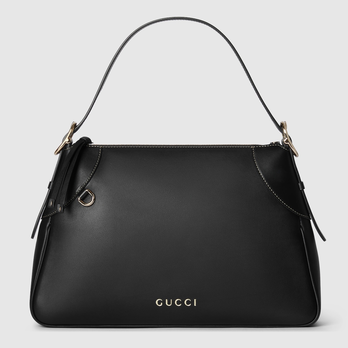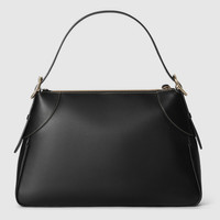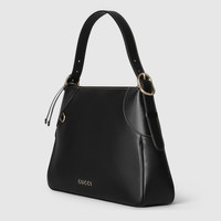 The new GG Emblem collection reinterprets the House’s history of elegance and craftsmanship. This medium shoulder bag features numbered notches on the adjustable shoulder strap, inspired by the equestrian world. - Black smooth leather - Light gold-toned hardware - Gold embossed Gucci script - Black microfiber lining - Additional D-ring for detachable items - Numbered notches on the adjustable shoulder strap - Contrast stitching - Inside: 1 zip pocket - Adjustable leather shoulder strap with 6.7" - 10.6" drop; length: 25.5" - Zip closure - Medium: 14.6" x 9.1"H x 3.1"D - Weight: 1.1lbs, approximately - Made in Italy - Fits iPhone Pro Max/Plus, Airpods, long wallet, lipstick, and more