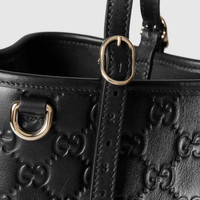 The GG Emblem collection reinterprets the House’s history of elegance and craftsmanship. This tote bag features numbered notches on the adjustable top handles, inspired by the equestrian world. - Black embossed GG leather - Light gold-toned hardware - Black microfiber lining - Additional D-ring for detachable items - Numbered notches on the adjustable handles; drop: 7.1" - 11" - Inside: 2 compartments and 1 zip central compartment - Adjustable leather shoulder strap with 20.3" - 22.4" drop; length: 41" - 44.9" - Magnetic snap closure - 11.8"W x 7.1"H x 4.3"D - Weight: 1.8lbs, approximately - Made in Italy - Fits iPhone Pro Max/Plus, Airpods, long wallet, and lipstick