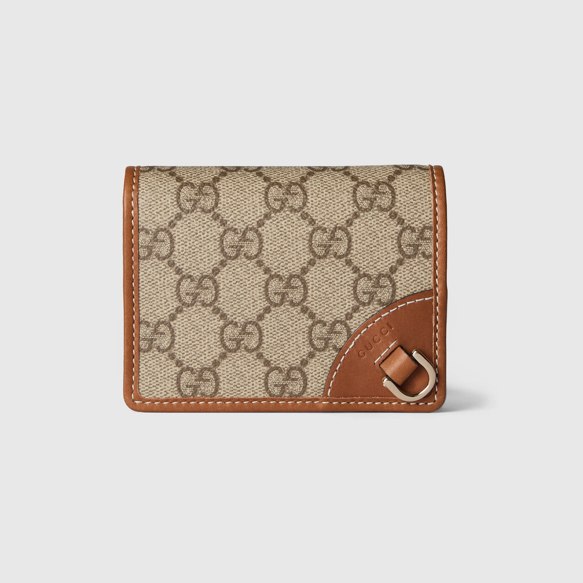The GG Emblem collection reinterprets iconic motifs through creativity and innovative functions, and is envisioned to be cherished for years to come. Introduced in the latest line of small accessories, this beige and dark brown mini wallet is crafted from the new GG Monogram canvas. Featuring multiple compartments, it closes with a functional snap button. - Beige and dark brown new GG Monogram coated canvas - Brown leather trim - Taffeta lining - Inside: 5 card slots, open pocket, 1 zip pocket, 1 bill compartment - Snap button closure - Closed: 4.3"W x 3.3"H x 1.2"D; Open 4.3"W x 6.9"H - Weight: 0.28lbs approximately - Made in Italy