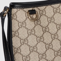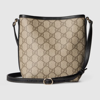 In the Fall Winter 2025 collection, part of the new GG Emblem collection, this mini bucket bag reinterprets House codes through a functional lens. Characterized by a compact silhouette and refined details, it features a long shoulder strap for comfortable wear, making it a versatile option from day to evening. - Beige and dark brown new GG Monogram coated fabric - Black leather trim - Gold-toned hardware - Green and red Web cotton lining - The bag charm shown is sold separately and not included with the handbag. - Adjustable leather shoulder strap drop: 20.5" - 22.8" - 5.9"W x 7"H x 3.1"D - Weight: approximately 0.47lbs - Made in Italy - Fits iPhone Pro Max/Plus, Airpods, mini wallet, and lipstick