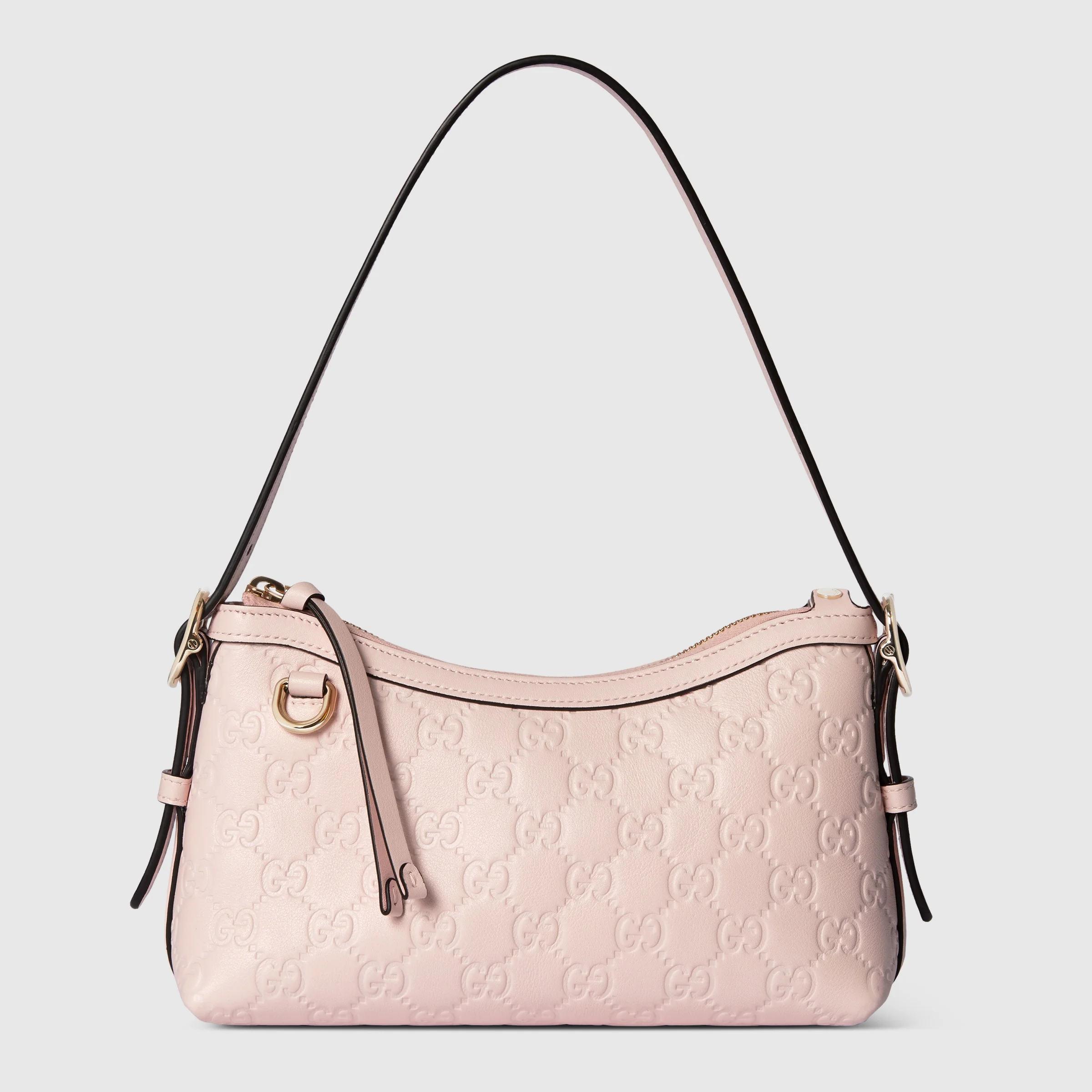 In the Fall Winter 2025 collection, the GG Emblem collection reinterprets the House’s history of elegance and craftsmanship. This shoulder bag is made from GG embossed leather. - Pink GG embossed laether - Light gold-toned hardware - Light pink cotton lining - The bag charm shown is sold separately and not included with the handbag. - Inside: open pocket - Leather shoulder strap: 7.1" – 9.1" drop; 25.2" length - Additional leather shoulder strap: 18.5" – 20.5" drop; 46.5" length - Zip closure - W8.7" x H5.5" x D3.1" - Weight: approximately 0.77lbs - Fits iPhone Pro Max/Plus, Airpods, long wallet, and lipstick