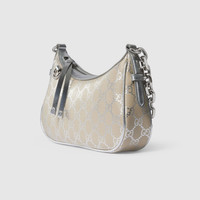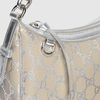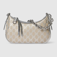 The GG Emblem collection reinterprets the House’s history of elegance and craftsmanship, introducing metallic styles which impart new light on the signature GG motif, complete with metallic leather trim. - Light beige and metallic silver laminated-effect GG Monogram coated fabric - Metallic silver leather trim - Silver-toned hardware - Light grey cotton linen lining - Inside: open pocket - Chain shoulder strap with 9.8" drop - Leather shoulder strap: 20.5" – 22.4" drop; 38.2" – 41.7" length - Zip closure - W9.4" x H6.5" x D2.2" - Weight: approximately 1.1lbs - Made in Italy - The bag charm shown is sold separately and not included with the handbag. - Fits iPhone Pro Max/Plus, Airpods, long wallet, and lipstick