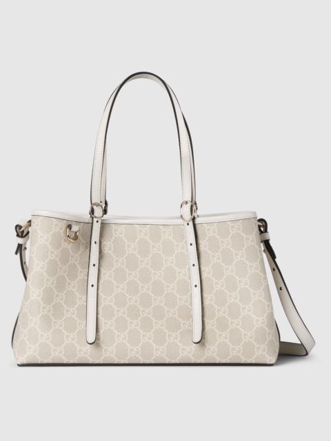 The new GG Emblem collection reinterprets the House’s history of elegance and craftsmanship. This small tote bag features numbered notches on the adjustable top handles, inspired by the equestrian world. - Beige and white new GG Monogram coated fabric - Off white leather trim with contrast stitching - The bag charm shown is sold separately and not included with the handbag. - Additional D-ring for detachable items - Numbered notches on the adjustable handles; drop: 7.1" - 11" - Inside: 2 compartments and 1 zip central compartment - Adjustable leather shoulder strap with 20.3" - 22.4" drop; length: 41" - 44.9" - Magnetic snap closure - Small: 11.8"W x 7.1"H x 4.3"D - Weight: 1.8lbs, approximately - Made in Italy - Fits iPhone Pro Max/Plus, Airpods, long wallet, and lipstick
