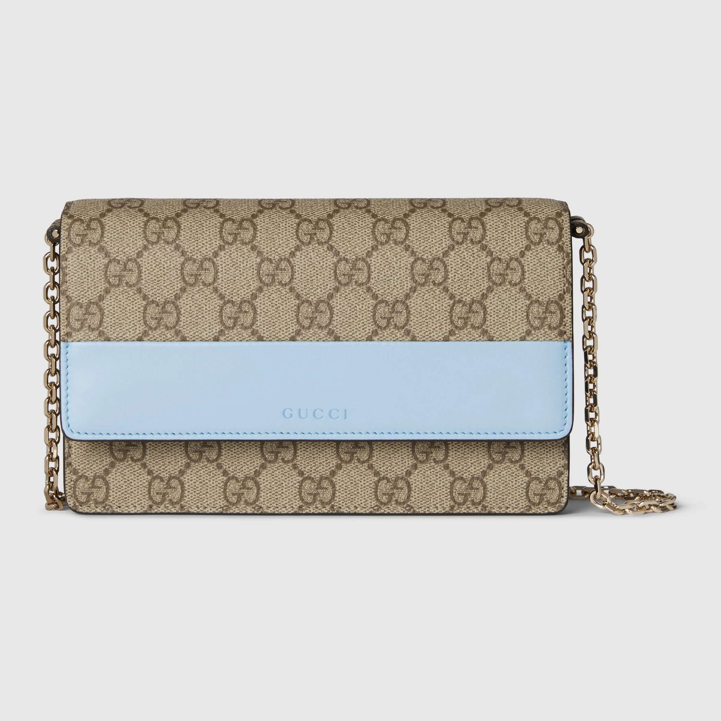 The GG Emblem collection reinterprets the House’s history of elegance and craftsmanship. This wallet on chain highlights a two-tone style with leather and GG Supreme, complete with multiple compartments. - GG Supreme - Beige and dark brown GG Supreme interior - Light gold-toned hardware - Light blue taffeta lining - Inside: 1 zip pocket, 2 flat pockets, 6 card slots - 7.9"W x 5.1"H x 1.6"D - Weight: 0.9lbs, approximately - Made in Italy - Fits iPhone Pro Max/Plus, Airpods, small wallet, and lipstick