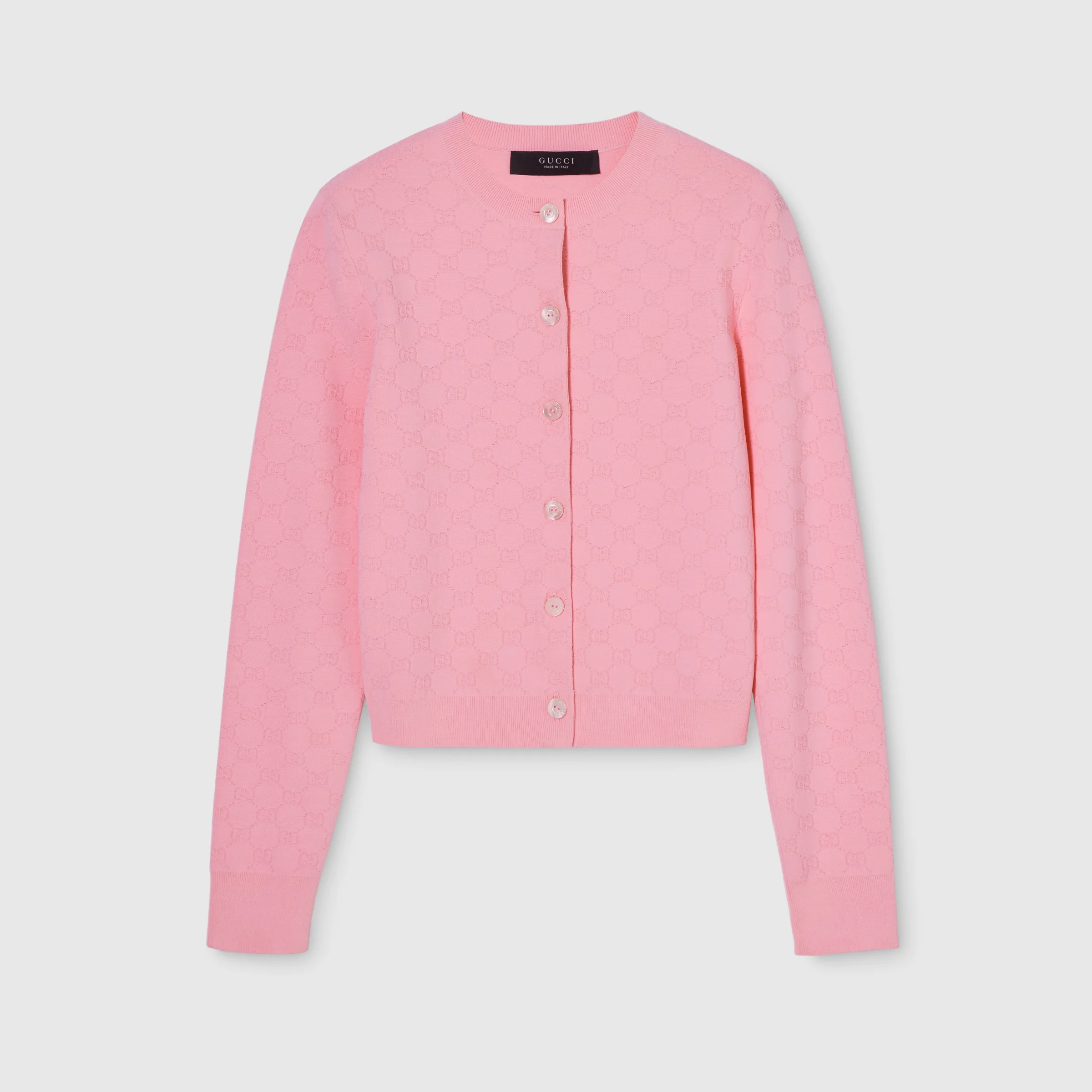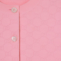 Introducing Spring Summer 2026. This style is inspired by the "La Principessa" look of La Famiglia. The collection reinterprets the House’s codes through singular personalities and distinctive aesthetic attitudes. This cardigan is presented in fine GG fabric jacquard. - Light pink fine viscose GG jacquard - Rib trim - Crewneck - Long sleeves - Front button closure - Length: 19.3", based on a size XS - Made in Italy - Fabric: 85% Viscose, 15% Polyester - Trimming: 73% Viscose, 14% Polyester, 12% Polyamide, 1% Elastane